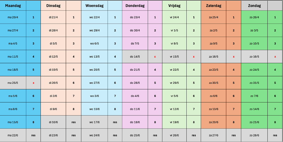 Inhaalweken (niet genummerde weken) zijn enkel voor uitval door ziekte van de trainer en/of andere zaken als overmacht (uitval verlichting of andere…)