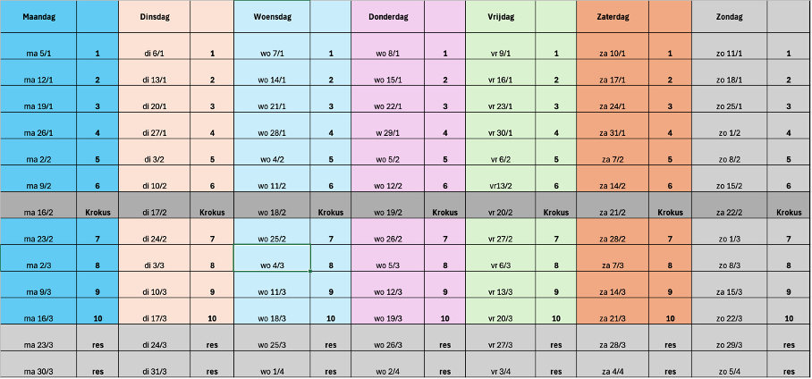 Inhaalweken (niet genummerde weken) zijn enkel voor uitval door ziekte van de trainer en/of andere zaken als overmacht (uitval verlichting of andere…)